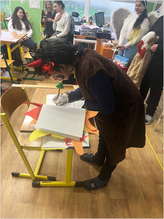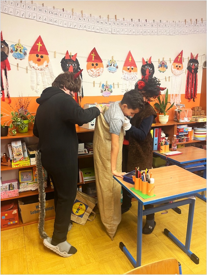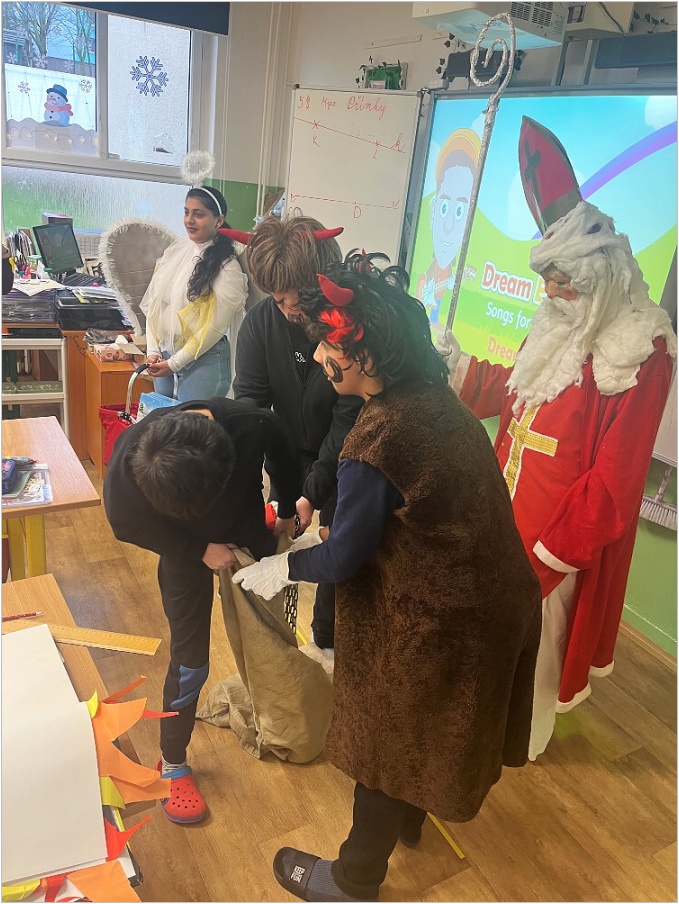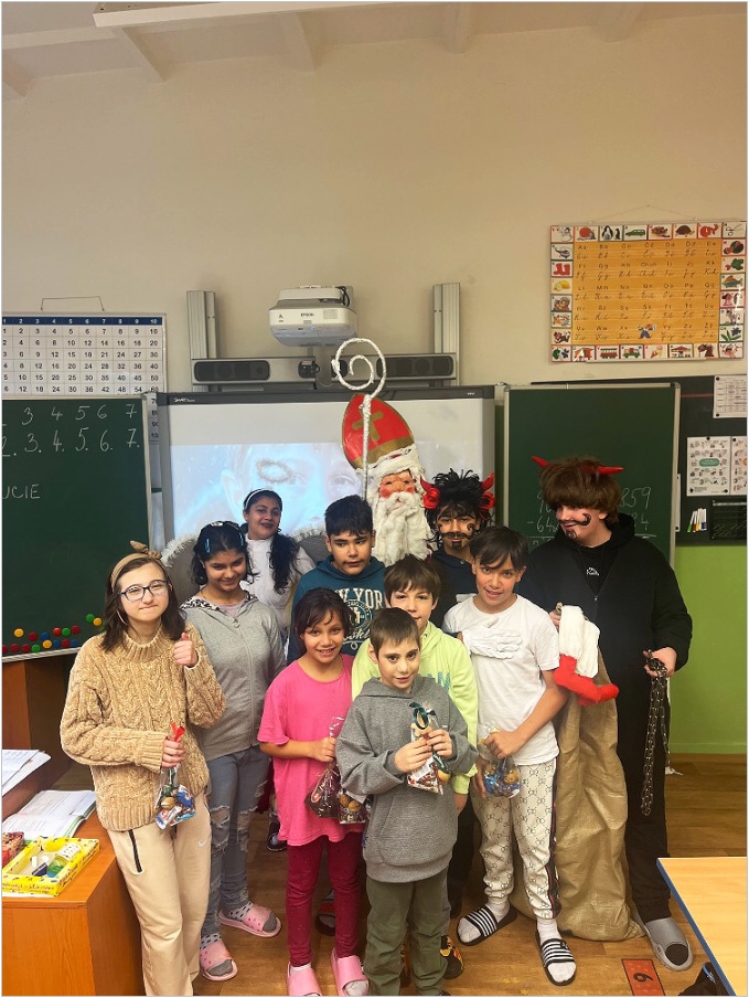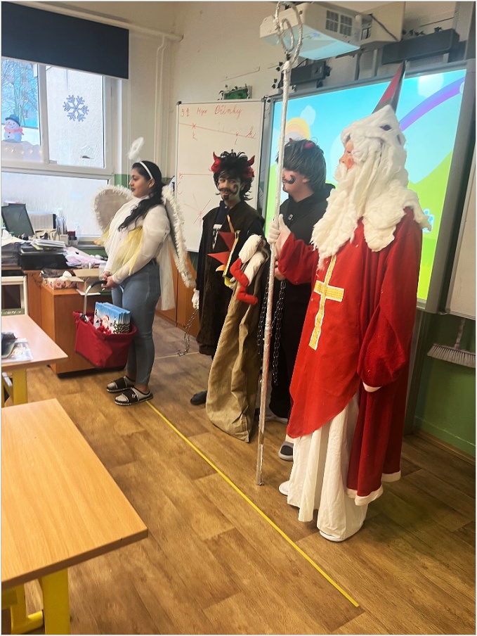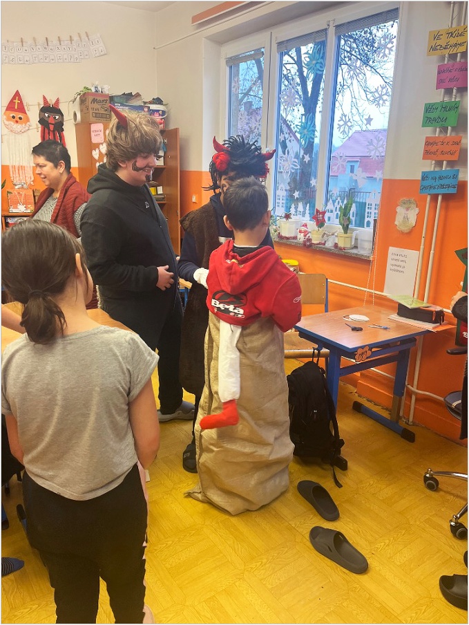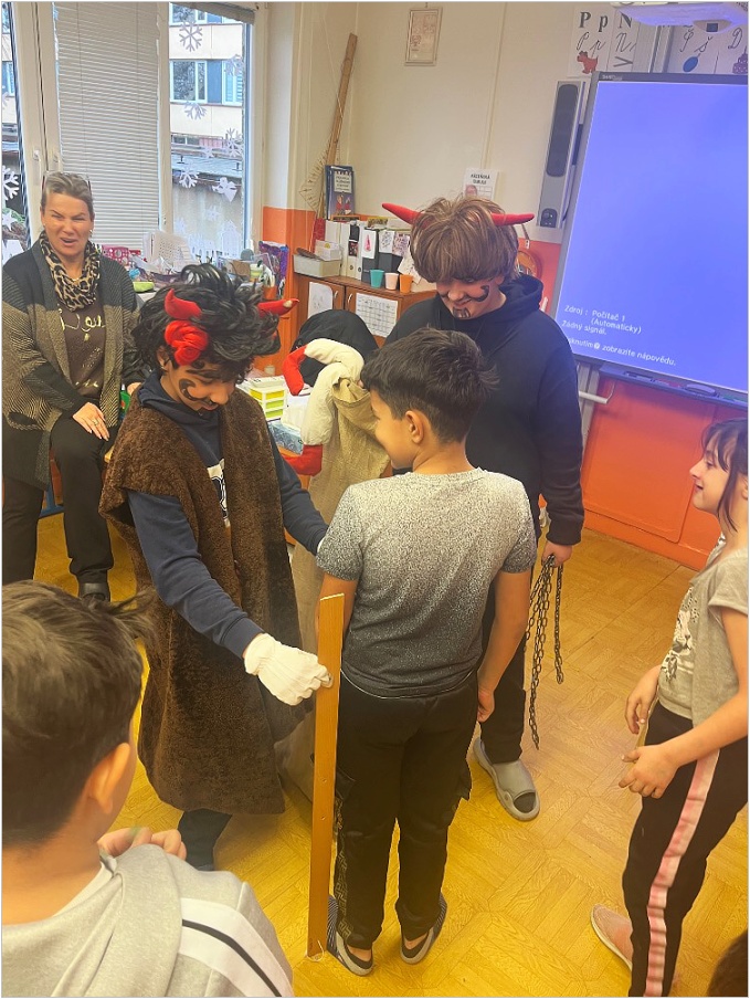 Mladším dětem předali malou nadílku a postarali se o veselou a přátelskou atmosféru. Mladší spolužáci měli radost z návštěvy, některé děti se trochu bály, ale čerti je pobavili a anděl vše zachraňoval svou laskavostí.