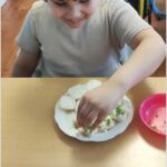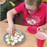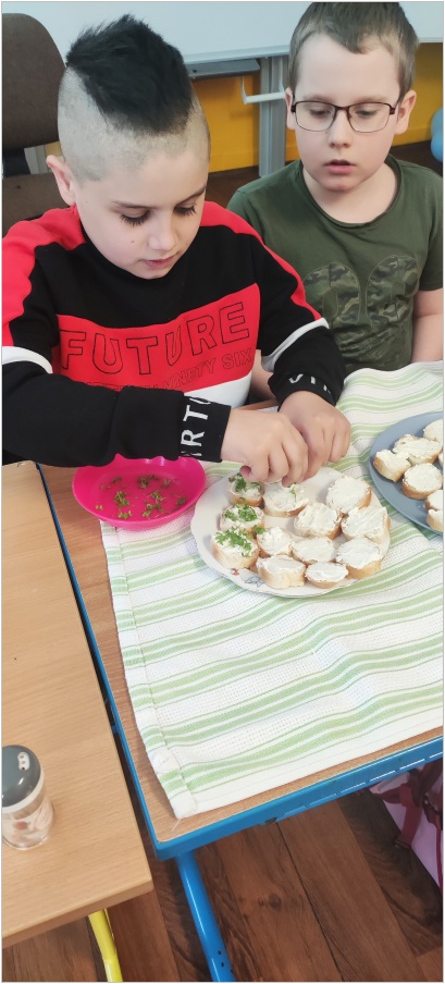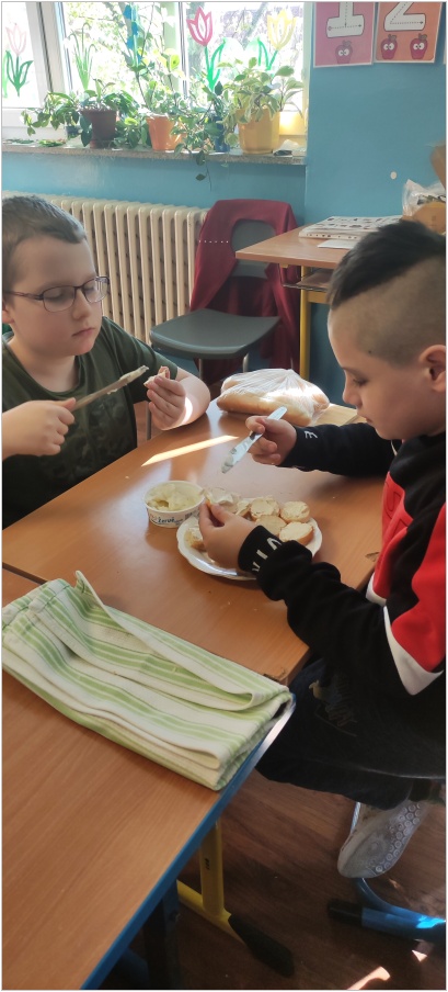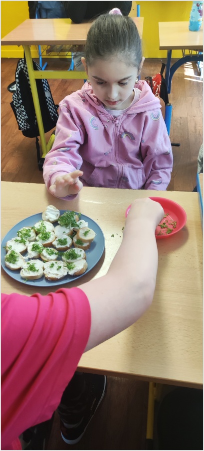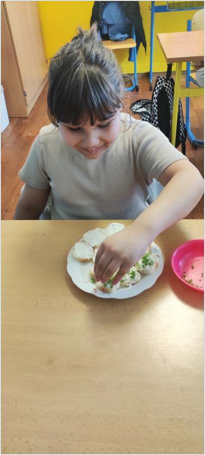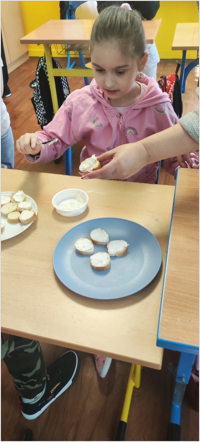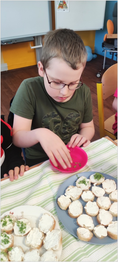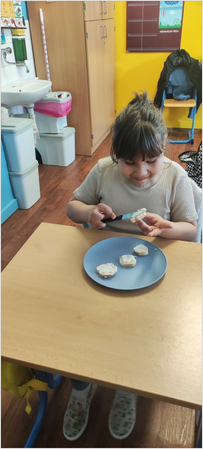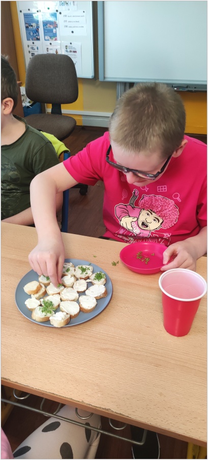 Svačina Domů Fotogalerie V hodině pracovního vyučování si žáci speciální třídy připravili zdravou svačinku. K přípravě jsme použili pečivo, sýr Žervé a žáky vypěstovanou bylinku – řeřichu. Příprava svačinky velmi pobavila a všem moc chutnalo.